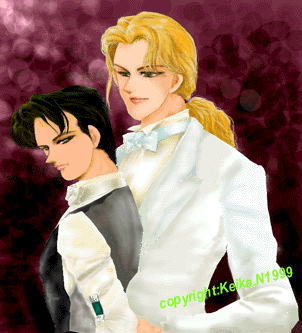 龍樹&拓斗-人形師?- お絵かきソフトの練習作品。1998年の作品……だったと思う。 悲しい試薬というもっと後のお話にでてくる結婚式の時のイメージ。 ラフを描いてた時には確かネームもあったような…… レイヤーとか知らないし、なかったので、スキャナーで読み込んだ下絵を 一々領域指定しながら直にブラシ彩色していったもの。一枚絵なのだ。 絵の具で描いた方がよっぽど楽だと思った。